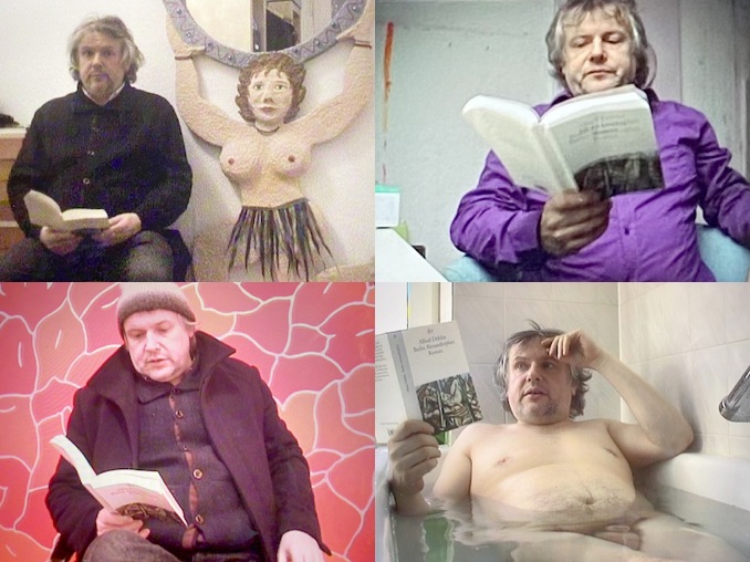 reading continues exactly where it ends. there is no actor sitting there, there is no lighting director, no cameraman, no sound man, no director, just the artist himself and his mini-dv camera, which was already out of date at the time of the recording. when you see and hear the artist, you see and hear imperfection: an upper austrian who tries to "berlinern" (speak like a person from berlin, döblin use this in some parts of the book) and who often struggles with the demanding text, which is completely new and unknown to him, reads somewhat stolidly, but then again with enthusiasm and fervor. it is about the act, the artist's desire to appropriate the book, to read it aloud to himself, and the camera follows this appropriation in all its facets.